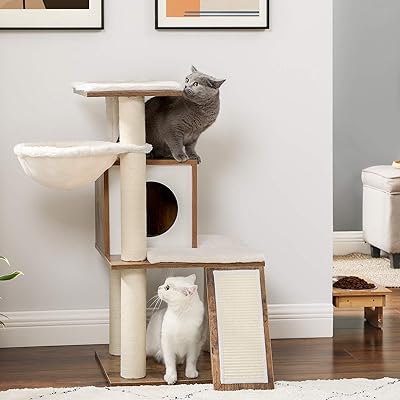 Cat trees towers and condos are the perfect way to give your kitty the added climb and elevation in the comfort and safety of your home. There are also other units that use fabric materials over wood. The trees design is large and tall.
